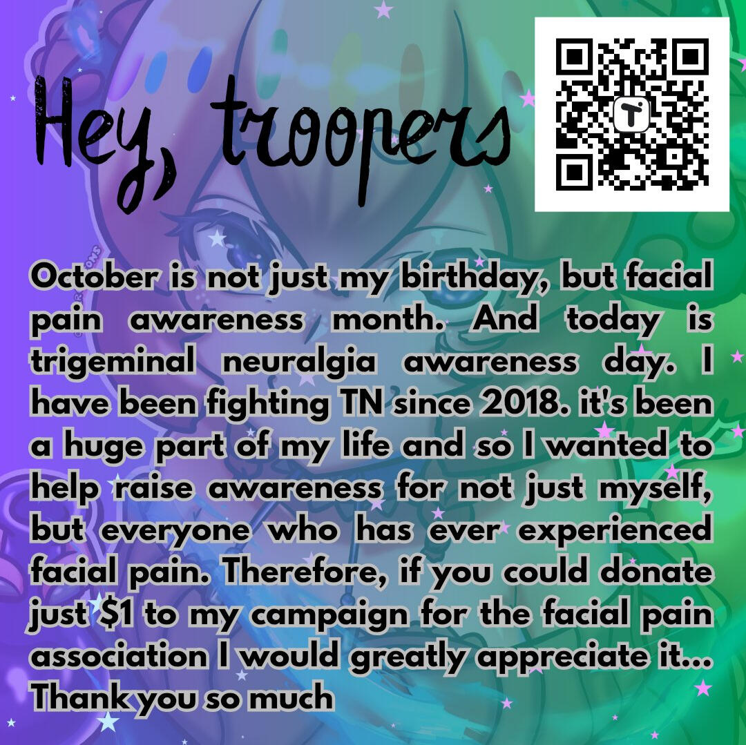 I have a condition called Trigeminal Neuralgia that creates intense pain on one side of my face at random intervals. This can stop me from working as it's very debilitating. Please be patient with me through this process. If you would like to donate towards the research of this cause, please see the qrcode or click the image. It leads to a titlify.